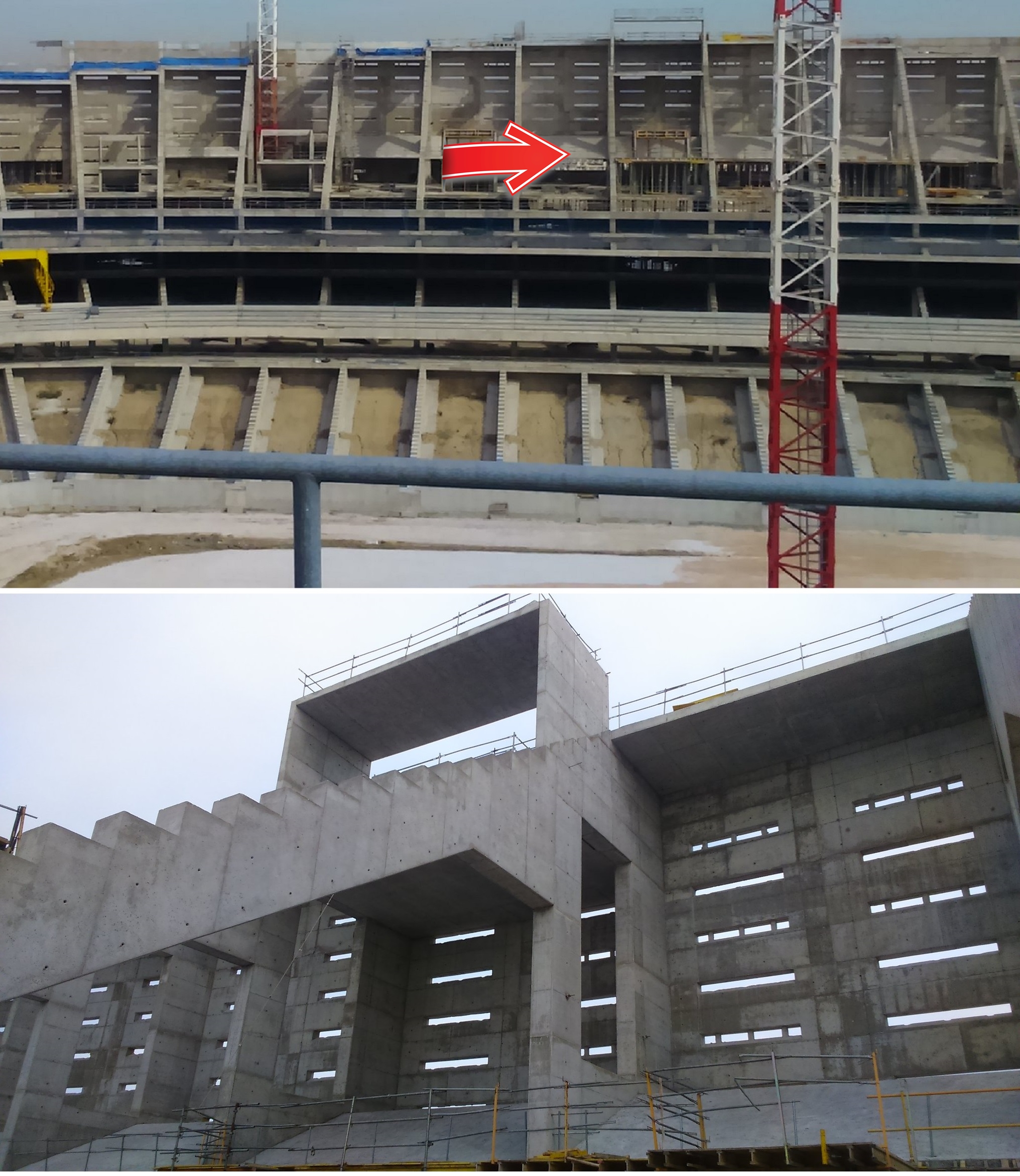 DETALLE DE LA OBRA (6 de Febrero 2016) : Han retirado todos los andamiajes puesto que acaban de concluir la fachada más exterior del Lateral Este, completándose y finalizando así toda la estructura ó esqueleto del estadio. Interiormente, entre fachadas de este Lateral, están realizando losas o uniones entre fachadas, grupos de escaleras superiores y algunos otros trabajos (hay que recordar que entre fachadas en esta zona van aseos). También ya son observables perfectamente todas las entradas al estadio, miradores y terrazas en este exterior del Lateral Este : *Imagen