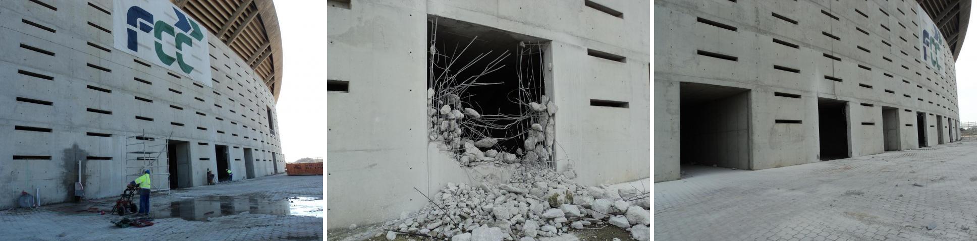 - Un detalle observado en el interior de la instalación existente. Parece que se están realizando grupos de escaleras de acceso al hall de la grada baja y que van directos desde los huecos que abrieron en la fachada : *Imagen detalle (Huecos abiertos en la fachada en Marzo : *Imagen)